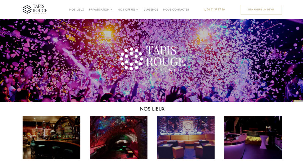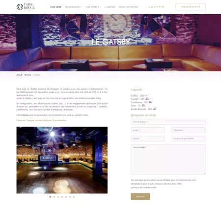 Pour ce projet, nous avons intégré la charte graphique de Tapis Rouge Évènement au thème WordPress proposé en amont : typographie, logo, couleurs… Toutes les pages du site sont administrables, jusqu’aux fiches de chaque lieu répertorié, qui incluent leur localisation géographique et des champs personnalisés pour fluidifier les demandes de devis.