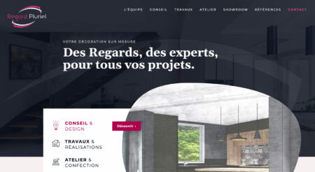 C’est avec Alizée Rault aux manettes du webdesign, et Marie Armand pour la stratégie éditoriale, que nous avons entièrement repensé le site web de Regard Pluriel. Cette entreprise costarmoricaine de décoration intérieure ambitionnait d’afficher un site à son image, à la fois haut de gamme et accessible. Pari tenu avec, côté développement web, des masques conçus spécifiquement pour sublimer les références et photographies dans les formes ovoïdes dessinées par Alizée. On peut le dire : fiers nous sommes du résultat !