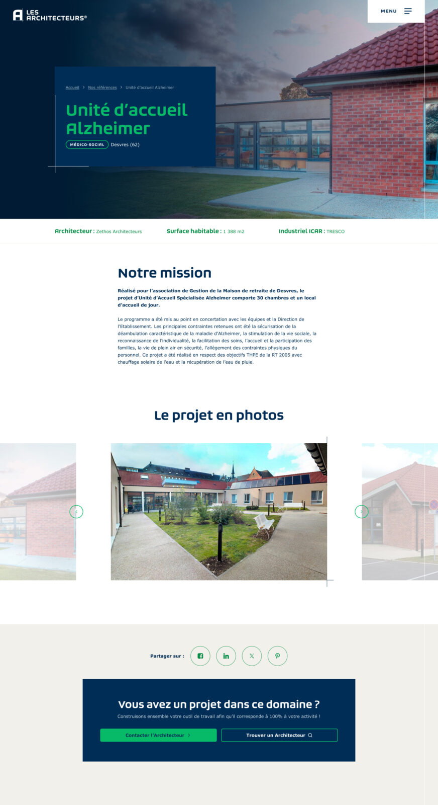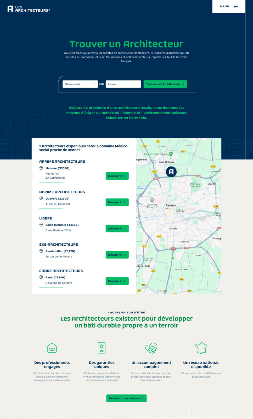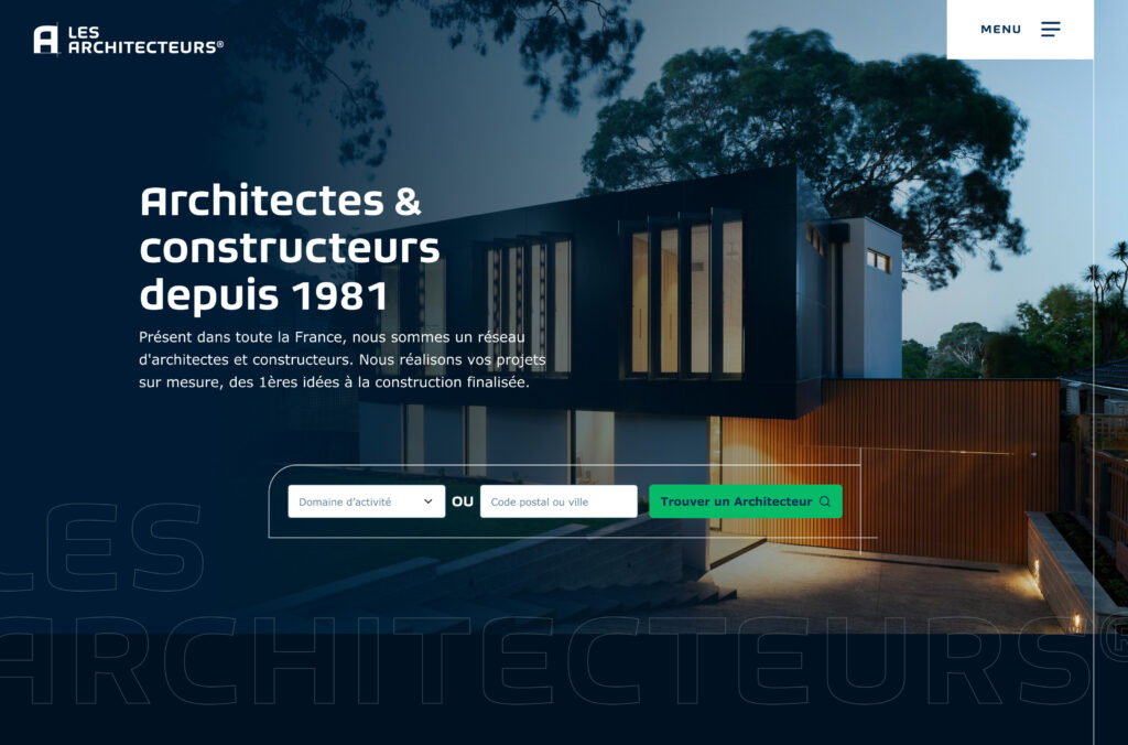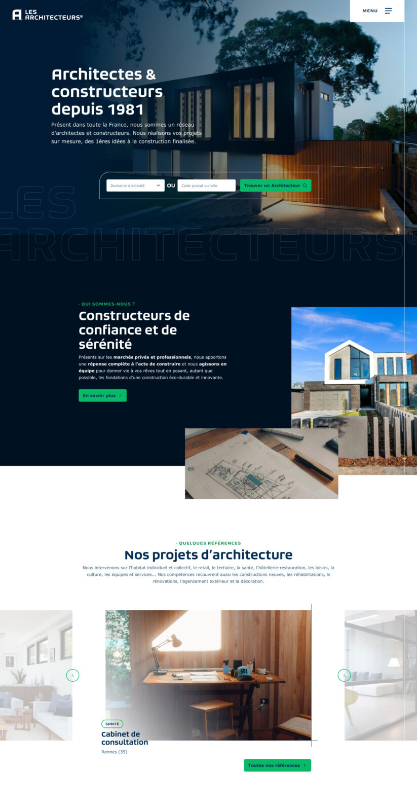 Création du site d’un réseau national d’architectes-constructeurs réunissant des agences partout en France. Le site présente l’approche complète du groupe, de la conception à la livraison, avec une mise en avant de la double compétence d’architecte et de constructeur, les valeurs de la coopérative et les différents types de projets réalisés (bâtiments professionnels, logements, équipements…). L’ergonomie est pensée pour faciliter la découverte des prestations, des témoignages clients et les informations pratiques pour entrer en relation avec les bureaux locaux.
