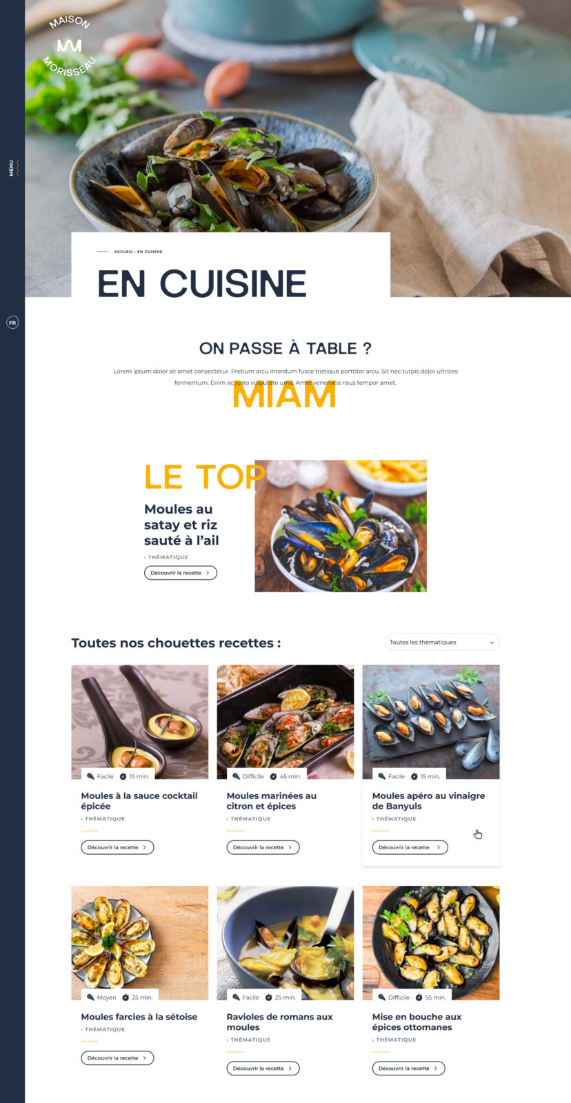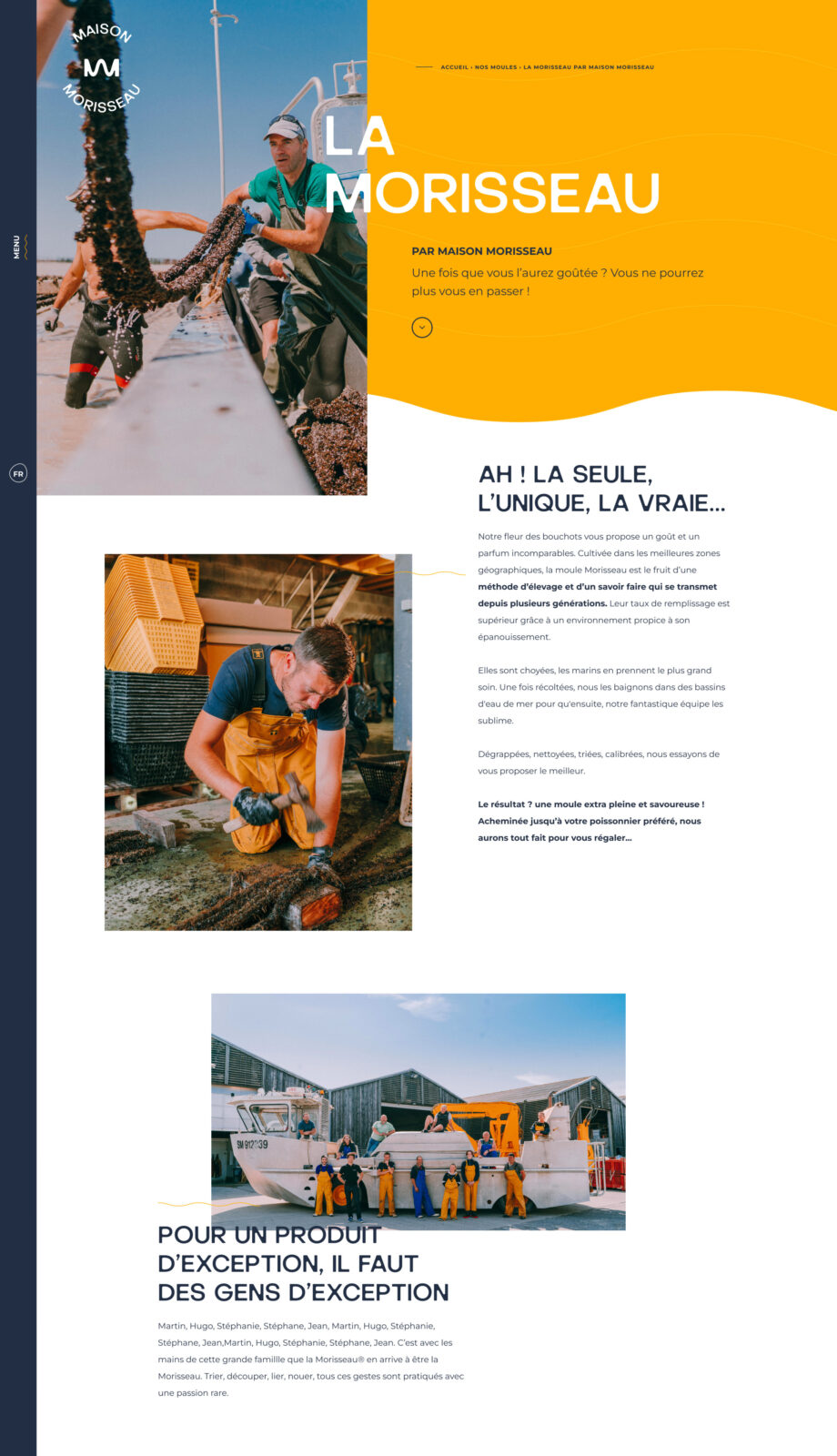 Conception et développement du site d’un producteur de moules de bouchot ancré dans une tradition familiale. Le site met en valeur l’histoire, le savoir-faire et les produits Maison Morisseau, avec une navigation claire vers les différentes catégories de moules, des pages dédiées aux méthodes de production et une présentation des recettes. L’ensemble est structuré pour refléter l’identité de la marque et faciliter le parcours des visiteurs (présentation de la maison, découverte des produits, recettes et points de contact).
