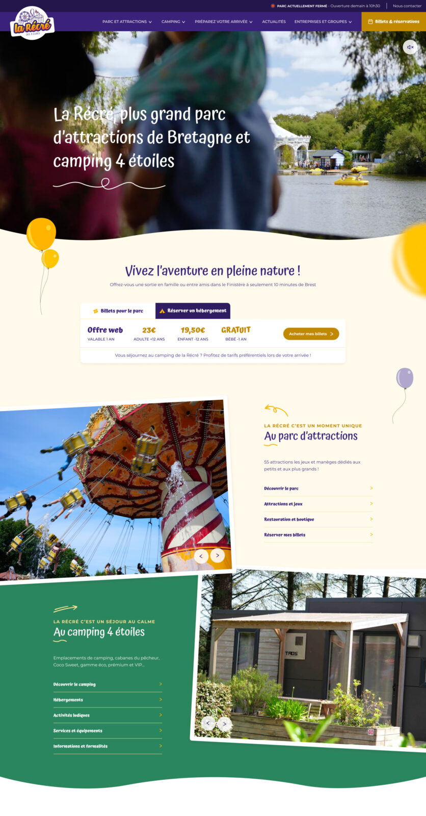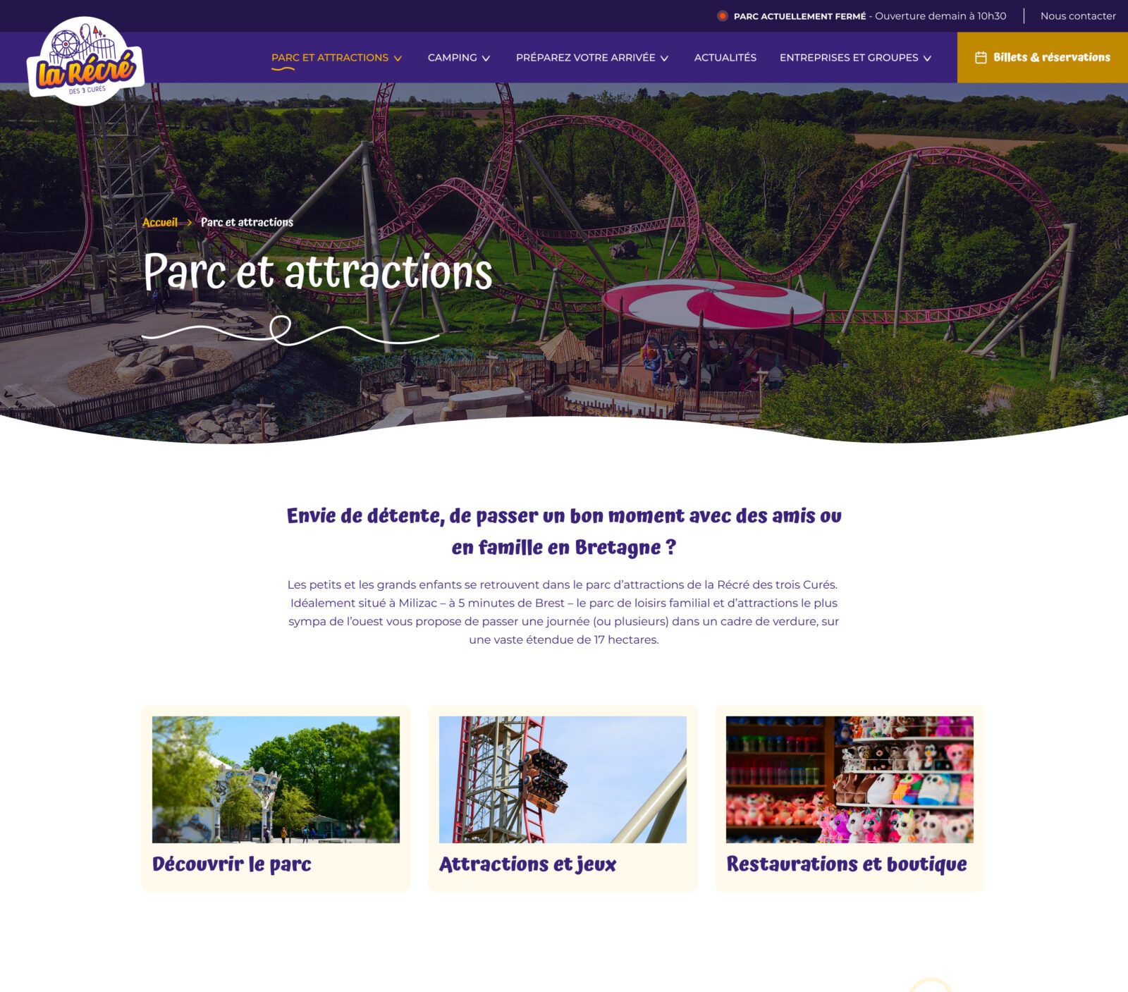 Développement du site d’un grand parc d’attractions situé à Milizac dans le Finistère, connu pour ses manèges, ses jeux pour tous les âges et son camping 4 étoiles. La structure du site met en avant l’ensemble des attractions, les informations pratiques (horaires, billetterie, accès) et les séjours possibles au camping, avec des pages qui favorisent la préparation de visite et la découverte du parc en images et en vidéos. L’organisation des contenus vise à aider les familles et groupes à planifier leur sortie ou séjour en Bretagne.