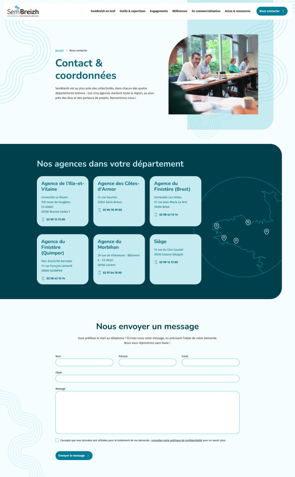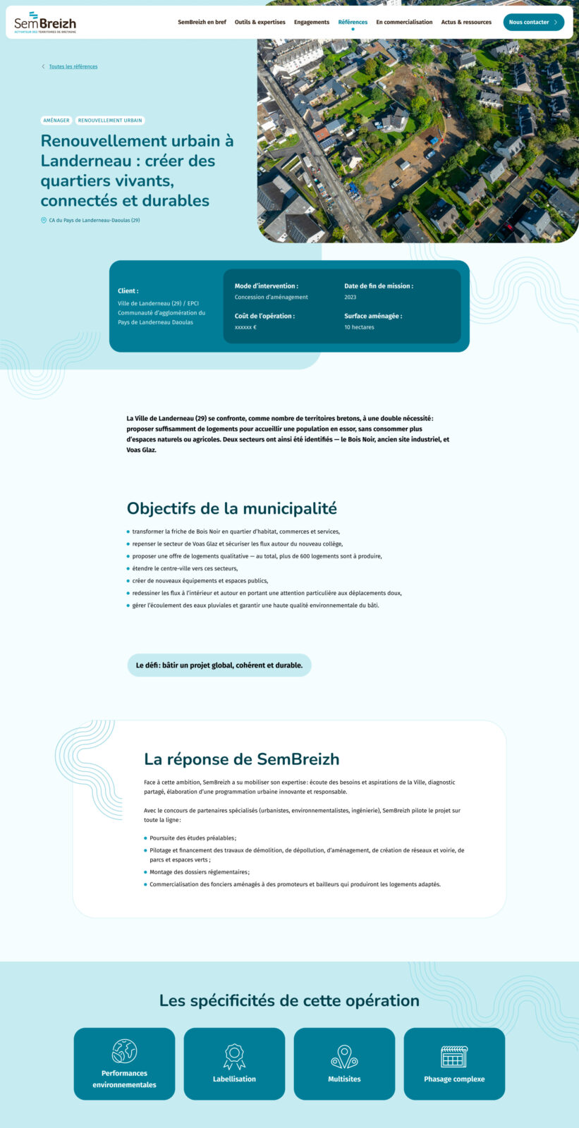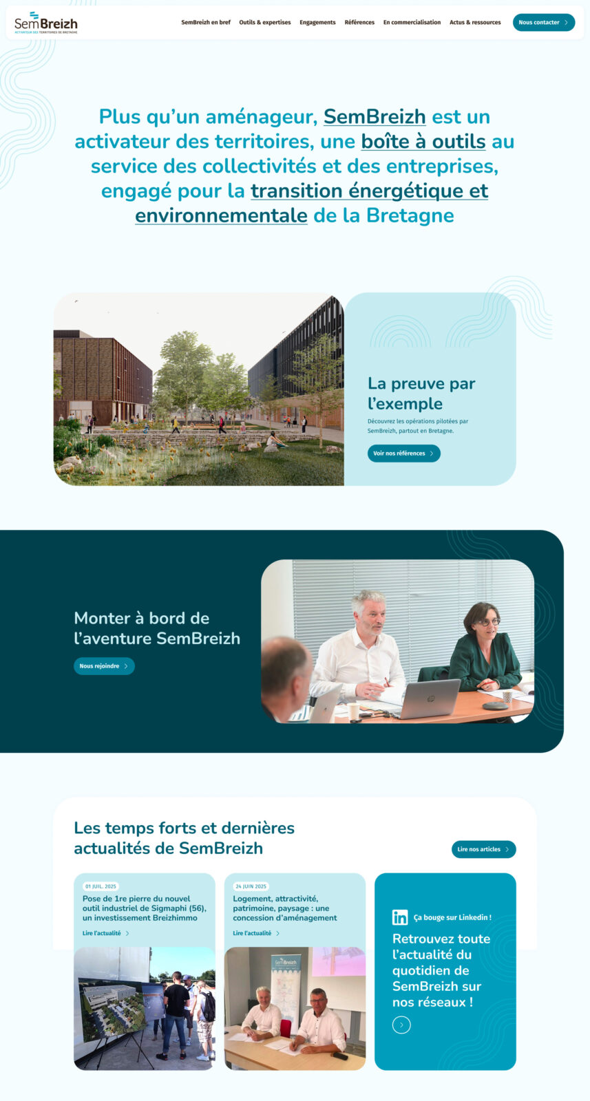 Refonte et mise en ligne du site d’une société d’economie mixte active en Bretagne, spécialisée dans l’accompagnement des collectivités et acteurs privés sur des projets d’aménagement, d’infrastructure, de transition énergétique et de développement territorial. Le site met en lumière les expertises (urbanisme, patrimoine immobilier, développement économique, tourisme et transition), les engagements en faveur des territoires bretons et une sélection de références d’opérations menées. L’organisation des contenus vise à clarifier les missions et les outils proposés aux porteurs de projets pour renforcer l’attractivité des espaces locaux.